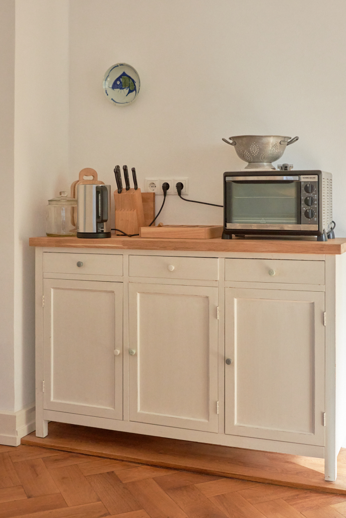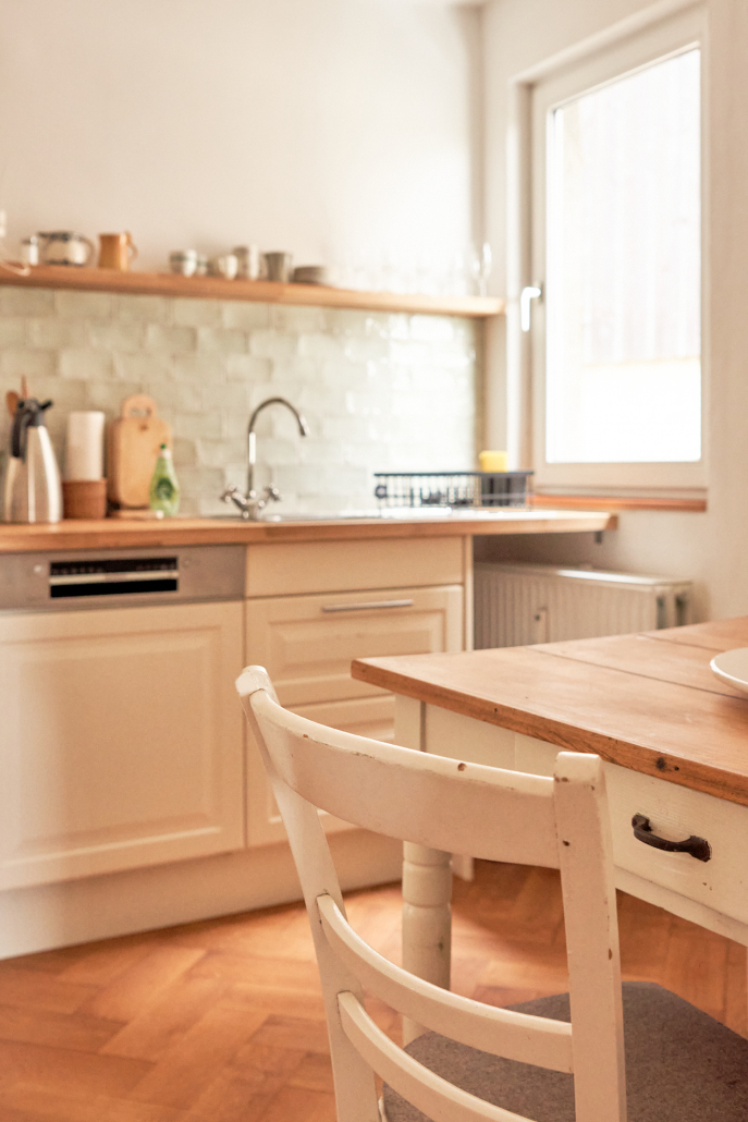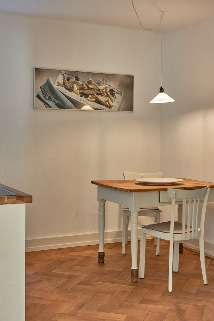 Die Küche vereint Funktionalität mit Charme und ermöglicht es sich selbst zu versorgen. Voll ausgestattet mit allem, was man so braucht, bietet sie bis zu vier Personen genug Platz zum gemeinsamen Zubereiten und Genießen. Die Küche ist ausgestattet mit einem vier Platten Kochfeld, einem Kühlschrank mit Eisfach, einer Spülmaschine, einer Kaffeemaschine, einem kleinen Minibackofen und allerlei Küchenutensilien. Falls etwas fehlen sollte, lassen Sie es uns wissen. Wer gerne kocht, findet hier gute Bedingungen – wer es eilig hat, erreicht in wenigen Schritten das Café Libre nebenan.