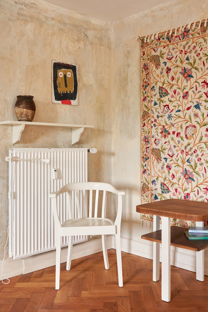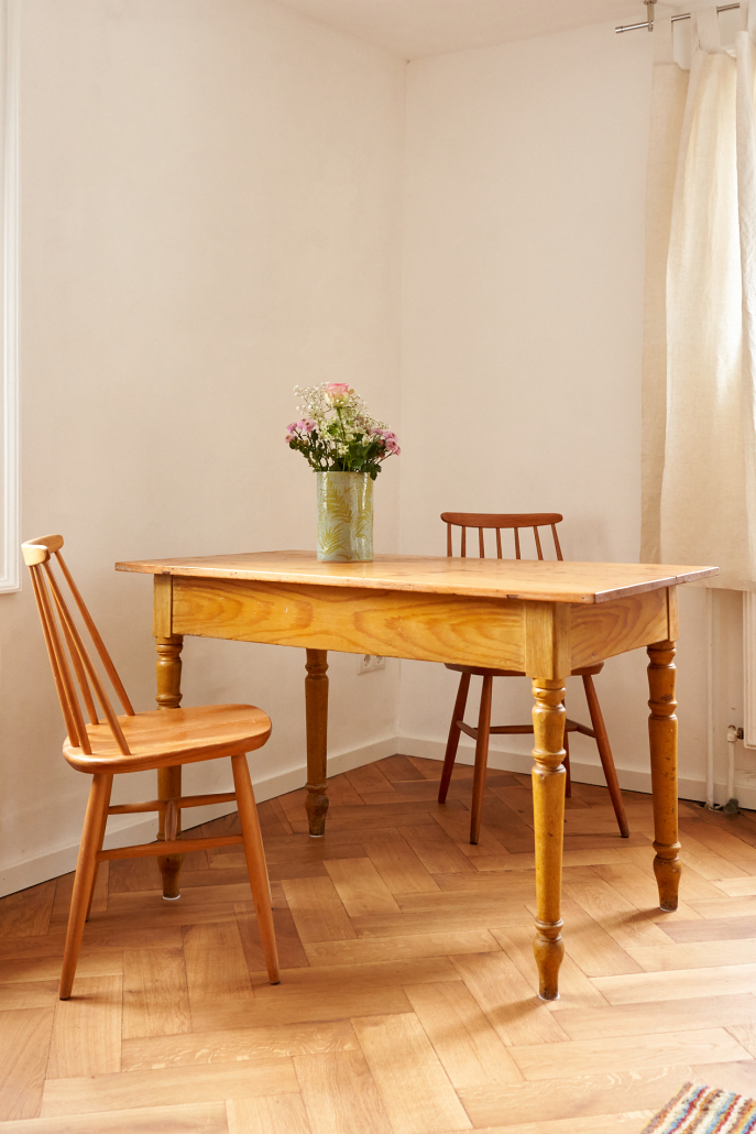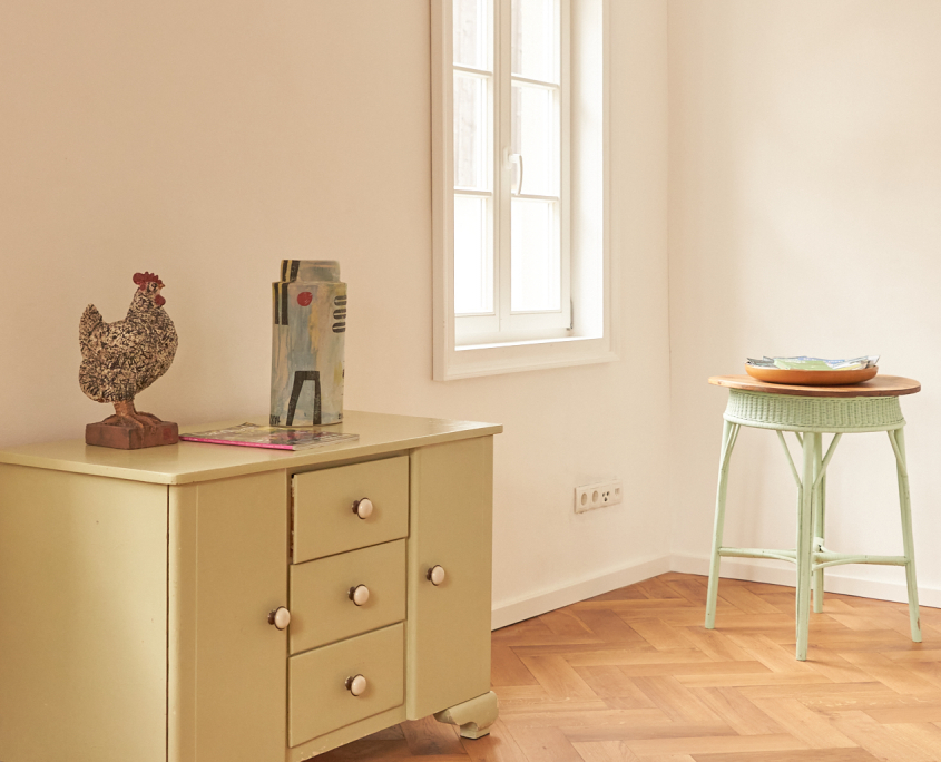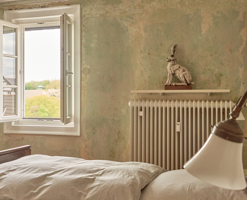 Im Schlafzimmer dominieren ruhige Farben, natürliche Materialien und malerische Wände. Zwei Betten aus 120 Jahre alter Eiche bilden das Zentrum des Raumes, ergänzt durch komfortable Matratzen. Vintagemöbel und Holzboden fügen sich harmonisch in die zurückhaltende Raumgestaltung ein. Der Blick ins Grüne unterstreicht die angenehme Atmosphäre. Ein Ort, der nicht nur zum Schlafen einlädt, sondern zum Ankommen und Wohlfühlen. Ausgestattet ist das Schlafzimmer mit einem Kleiderschrank, einem Doppelbett aus zwei Einzelbetten (Länge je 1,90 m) und einer kleinen Sitzecke.